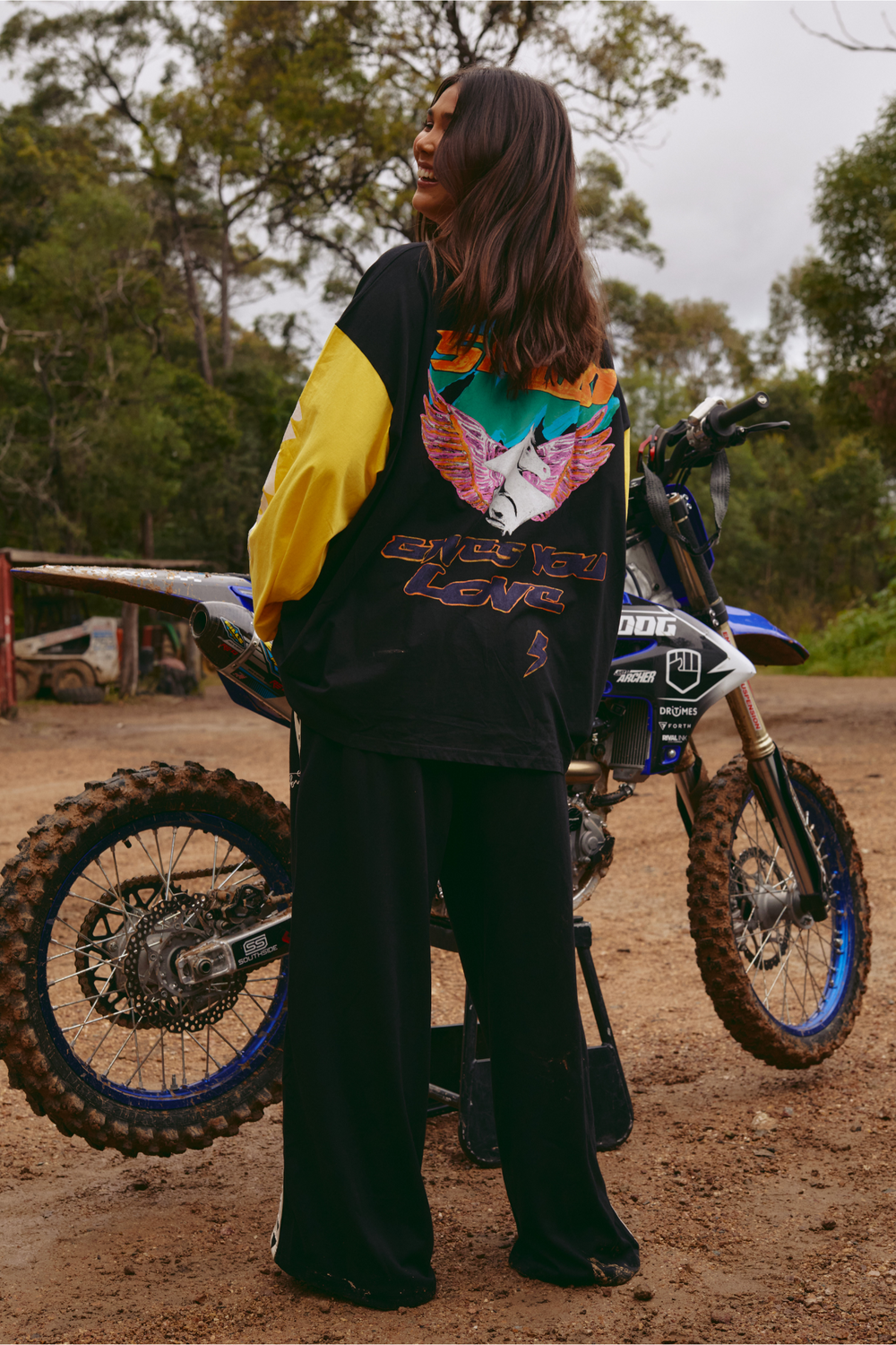 Washed, worn, and ready to ride. Our long sleeve vintage tee is giving main character at the track vibes. It’s made from 100% cotton, enzyme washed to feel like you’ve had it since your first race, and finished with bold colour blocking, a statement front & back print with Sabbi arm prints.