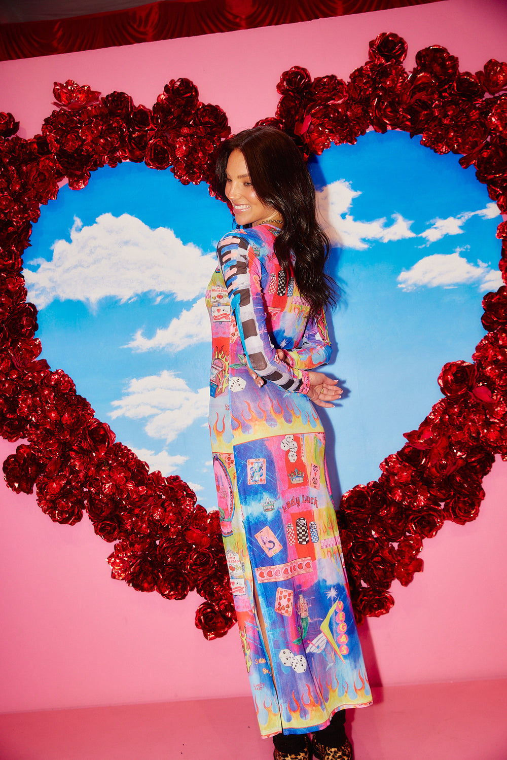 Prepare to turn heads in this stretch mesh dress. The print on this one is completely hand painted by Jase in all things Vegas.