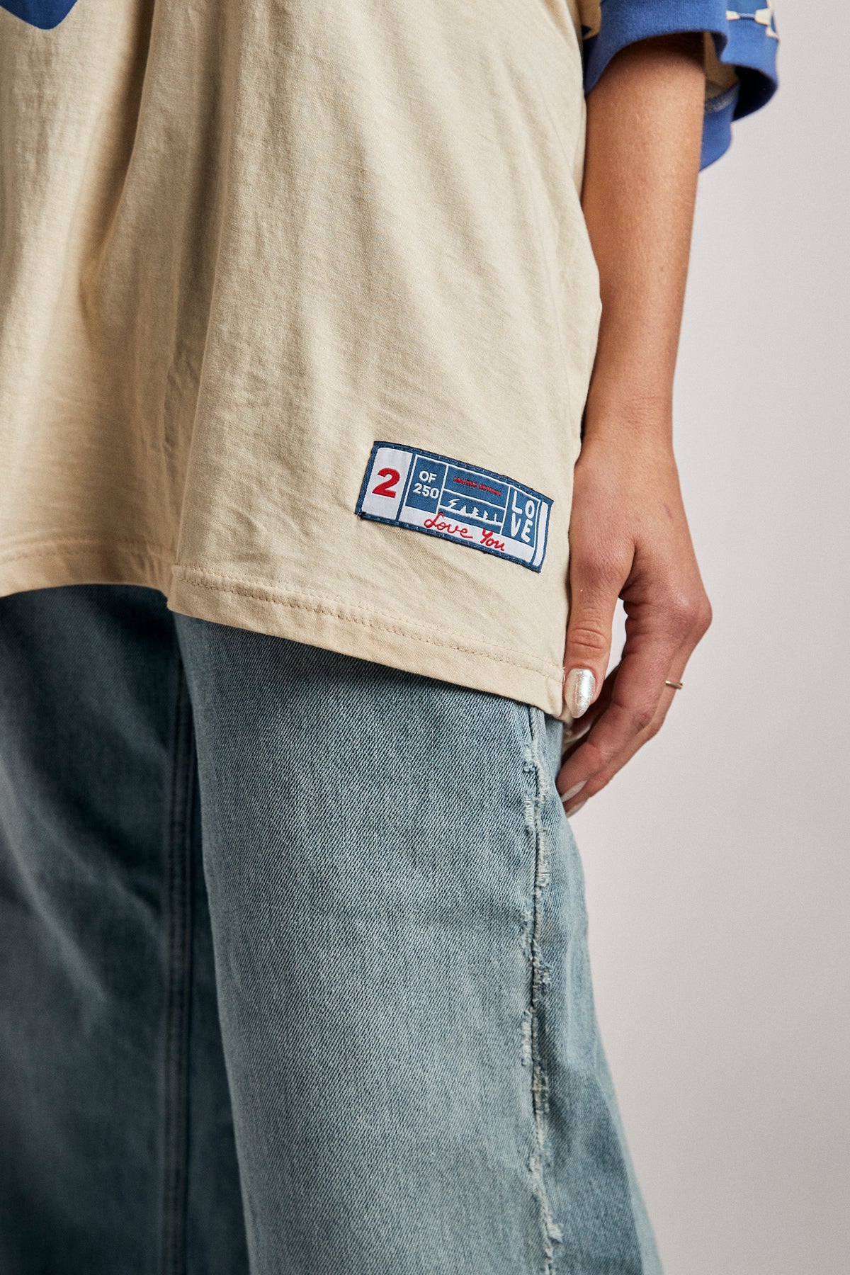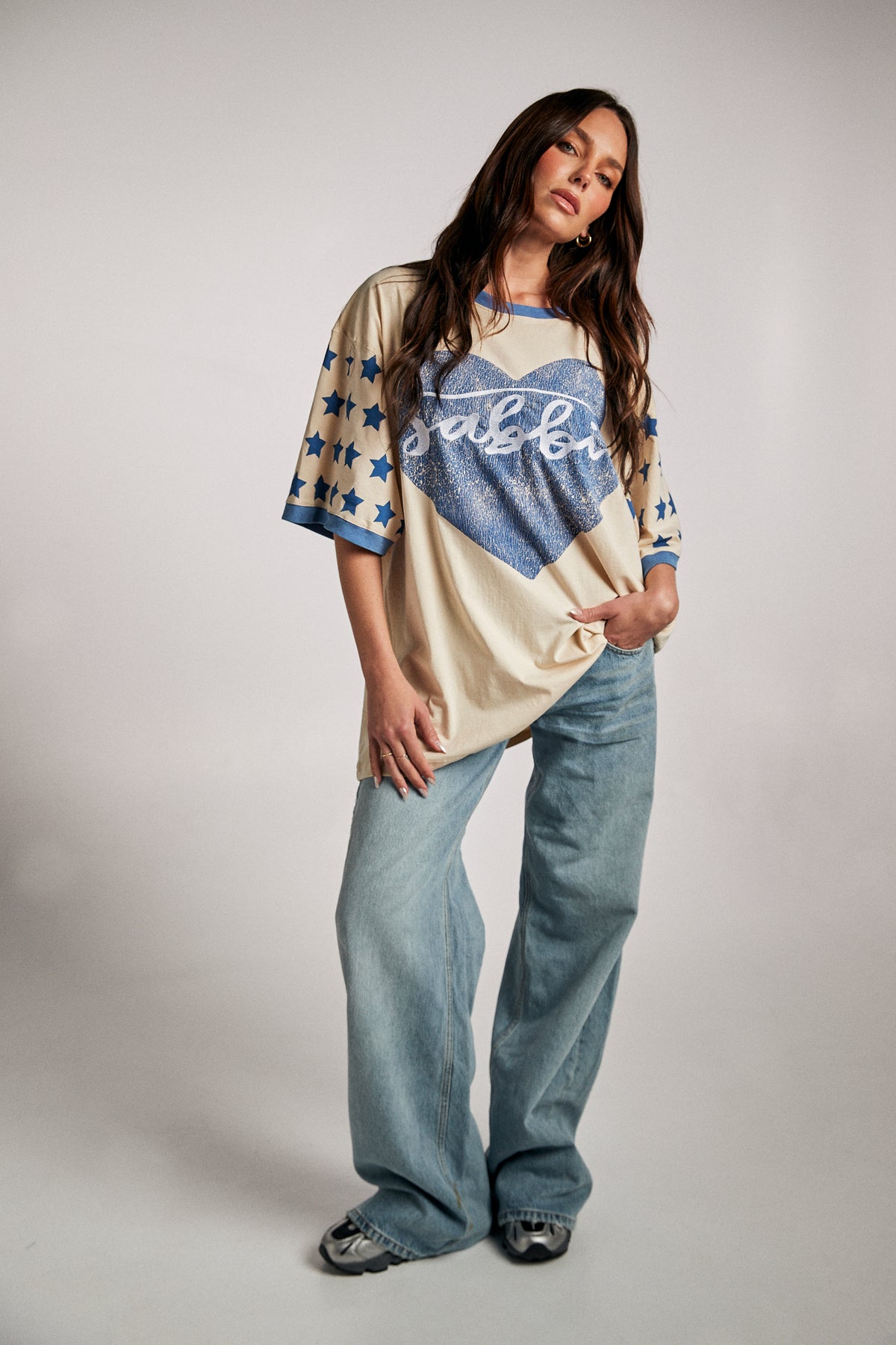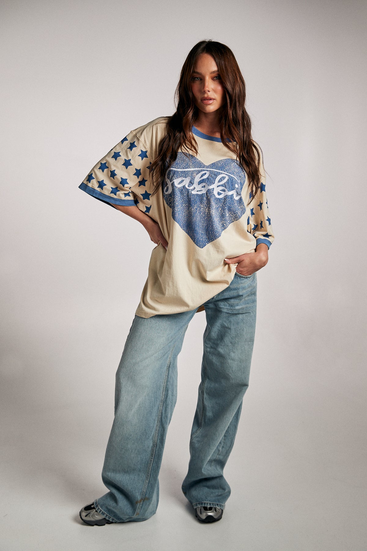 Wear your vibes 🌟 Whether you’re out chasing sunsets or chilling with friends, this tee brings the energy. A big textured red heart wraps the “Sabbi” signature across the chest, while your sleeves sparkle with star power. Contrast blue sleeve trim finishes the look with vintage flair.