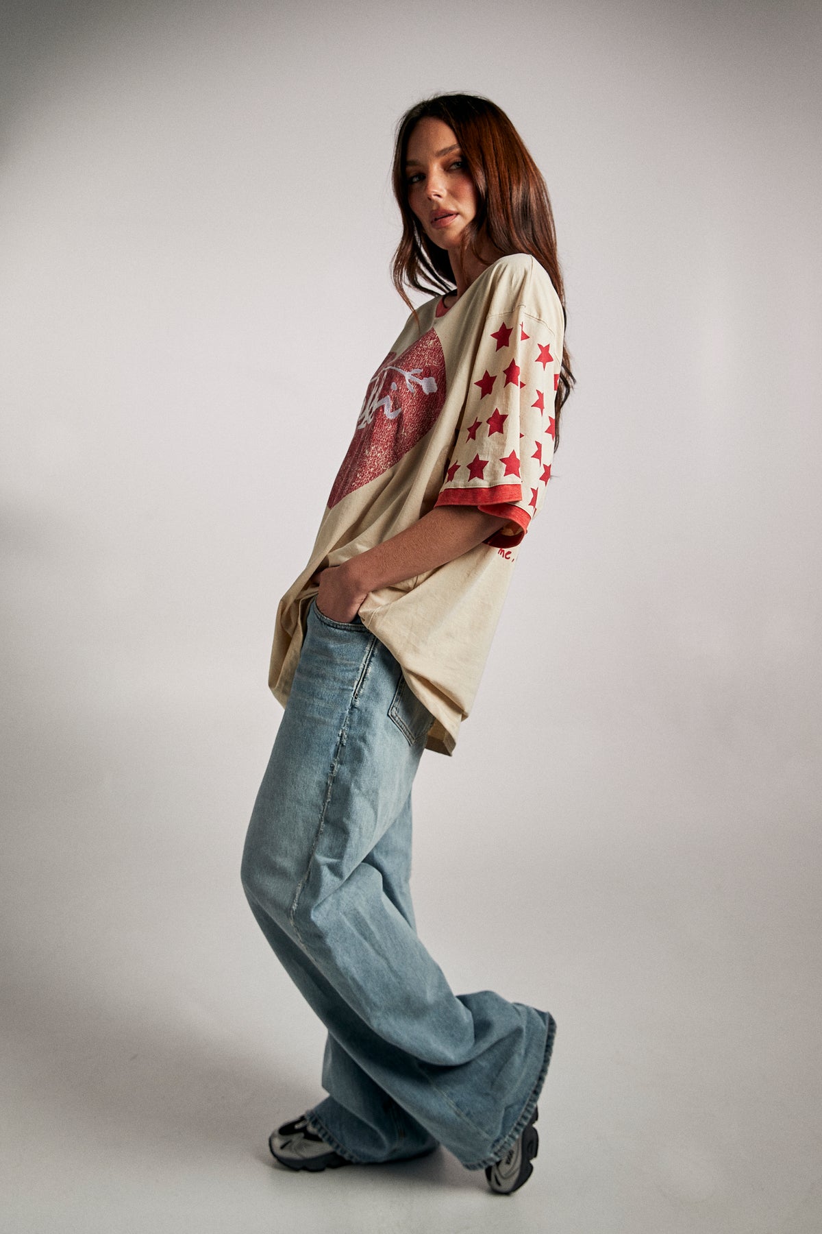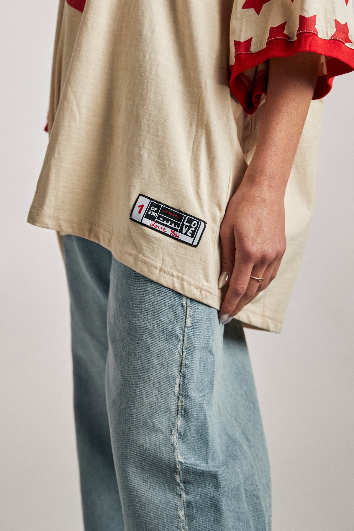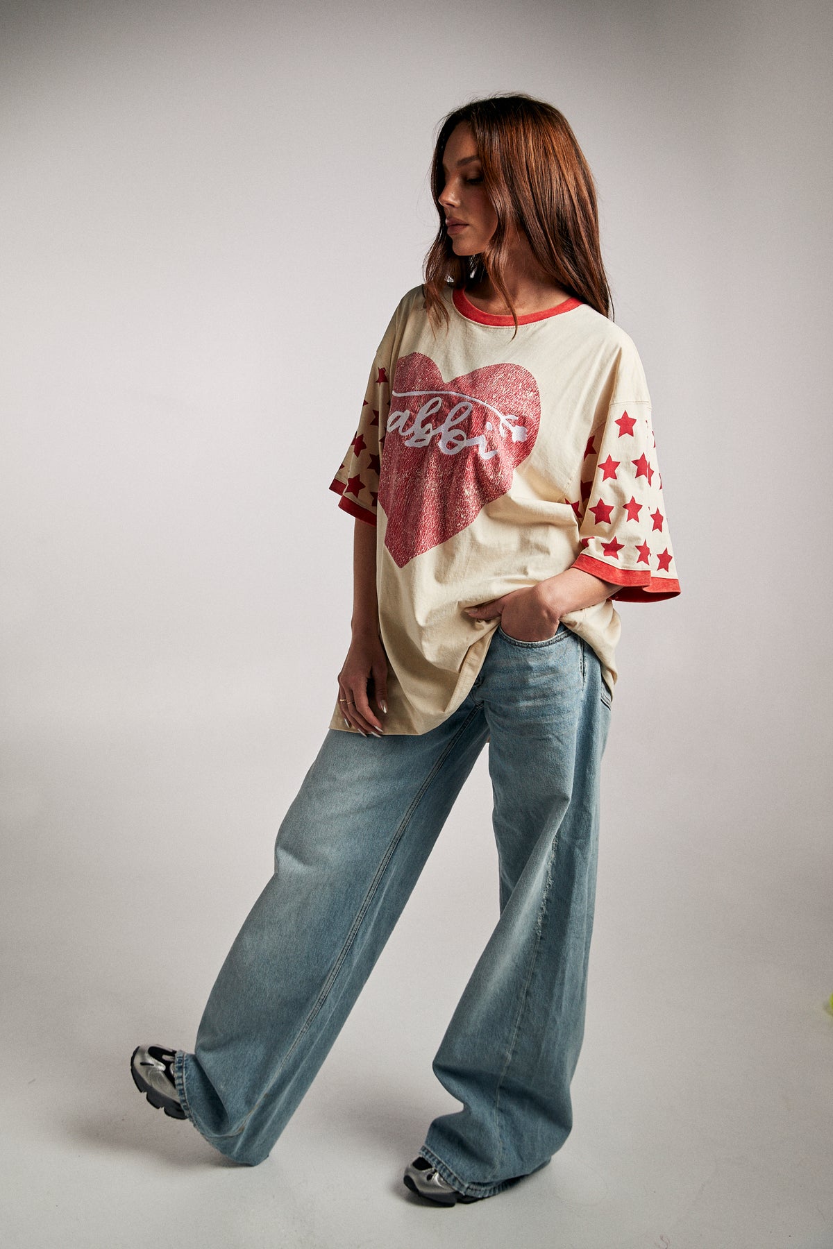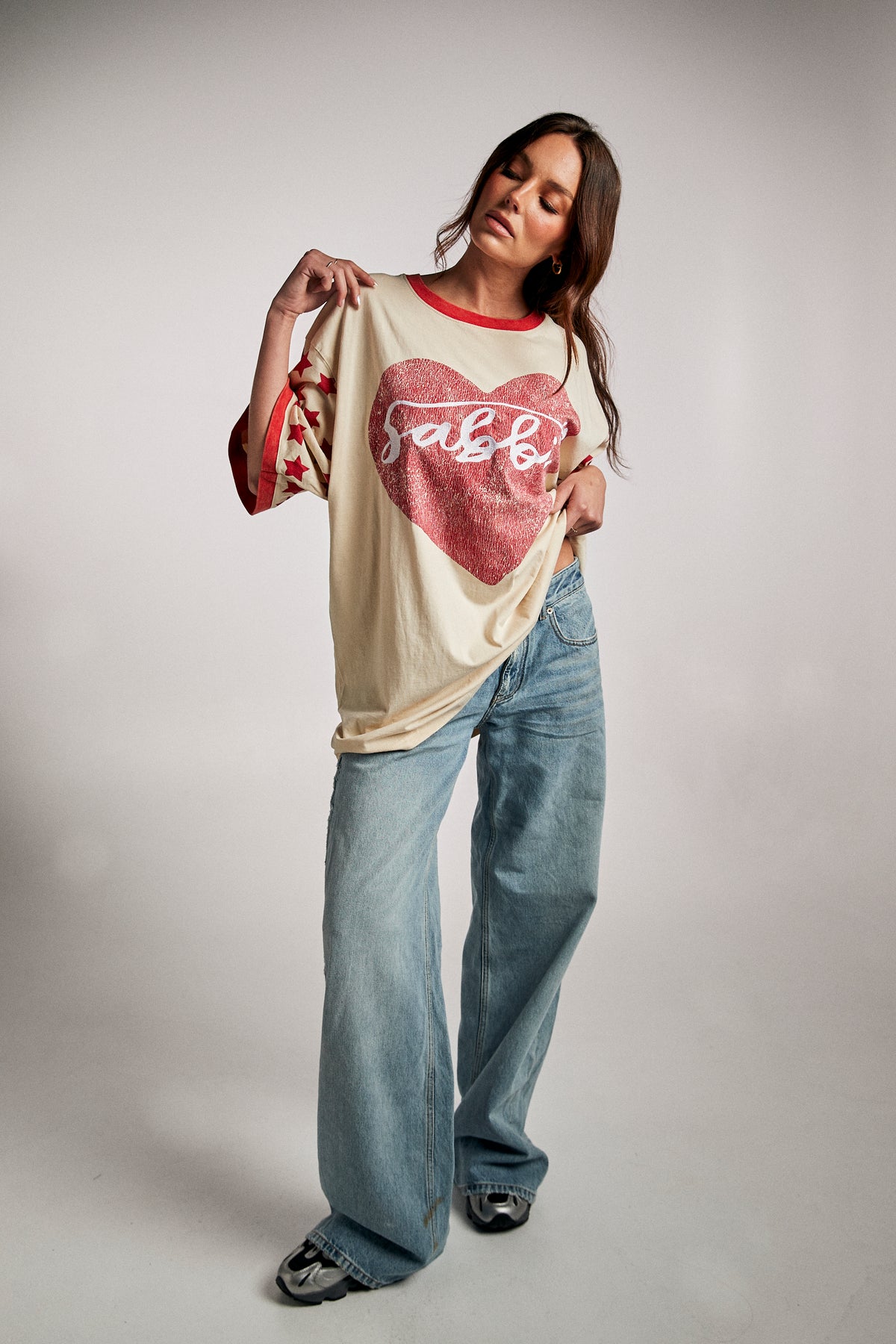 Wear your vibes 🌟 Whether you’re out chasing sunsets or chilling with friends, this tee brings the energy. A big textured red heart wraps the “Sabbi” signature across the chest, while your sleeves sparkle with star power. Contrast red ringer trim finishes the look with vintage flair.