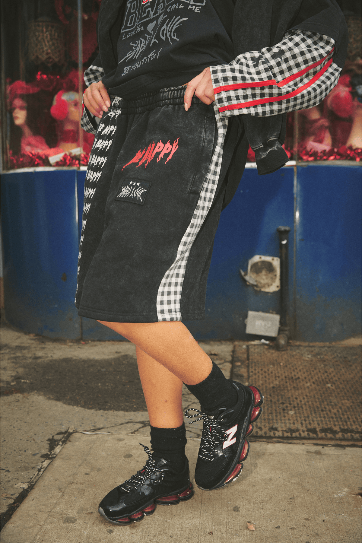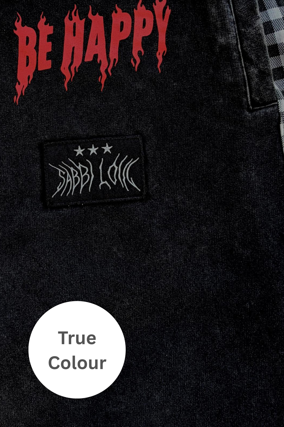 Bold BE HAPPY graphics bring the attitude, while the contrast gingham side panels keep the look sharp and unmistakably Sabbi. Easy to wear, hard to ignore.
