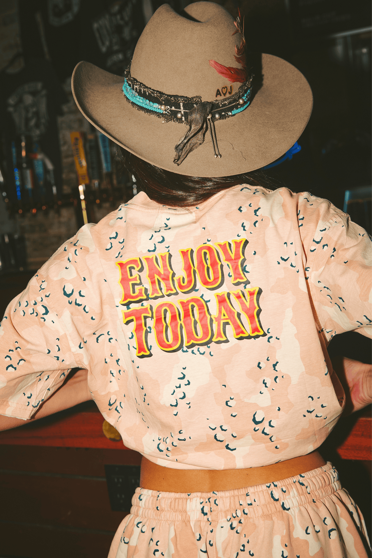 An everyday essential with a Sabbi Ranch attitude. The Be-Youtiful Ranch Tee in pink camo is designed in an easy-to-wear silhouette, slimmer than our oversized tees and with a vintage-inspired wash and custom all-over camo print. Featuring bold Sabbi Ranch branding through the front and a statement Enjoy Today graphic on the back, this tee brings together western energy with a playful, feel-good edge.