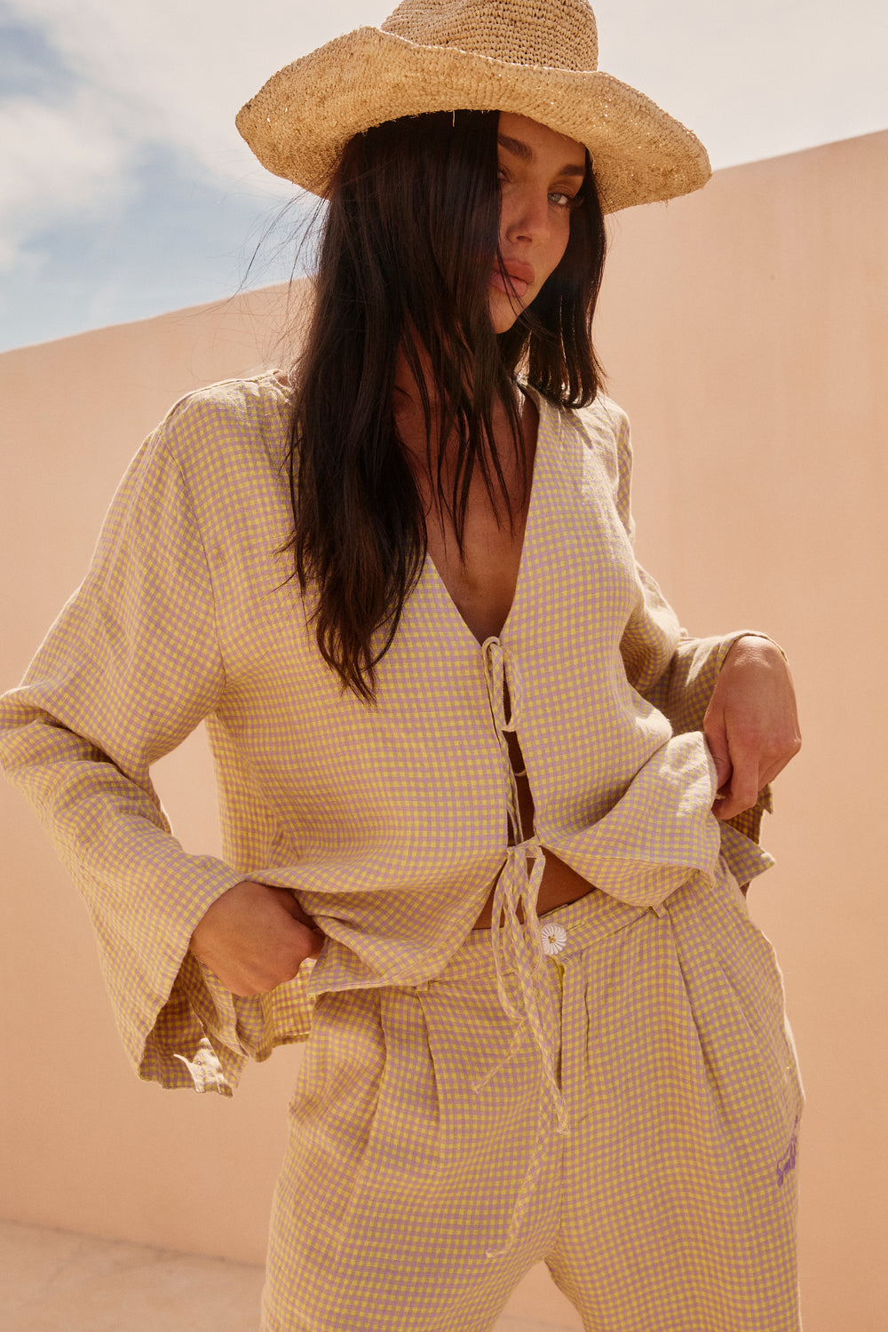 GINGHAM TIE UP SHIRT - CHARTREUSE & PURPLE