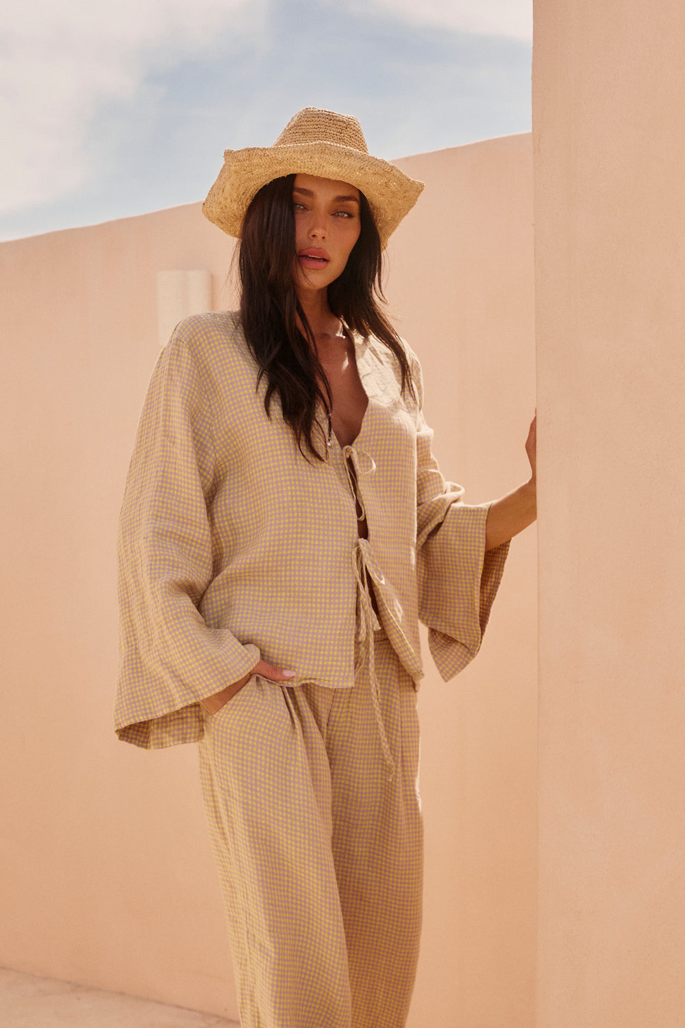 GINGHAM TIE UP SHIRT - CHARTREUSE & PURPLE