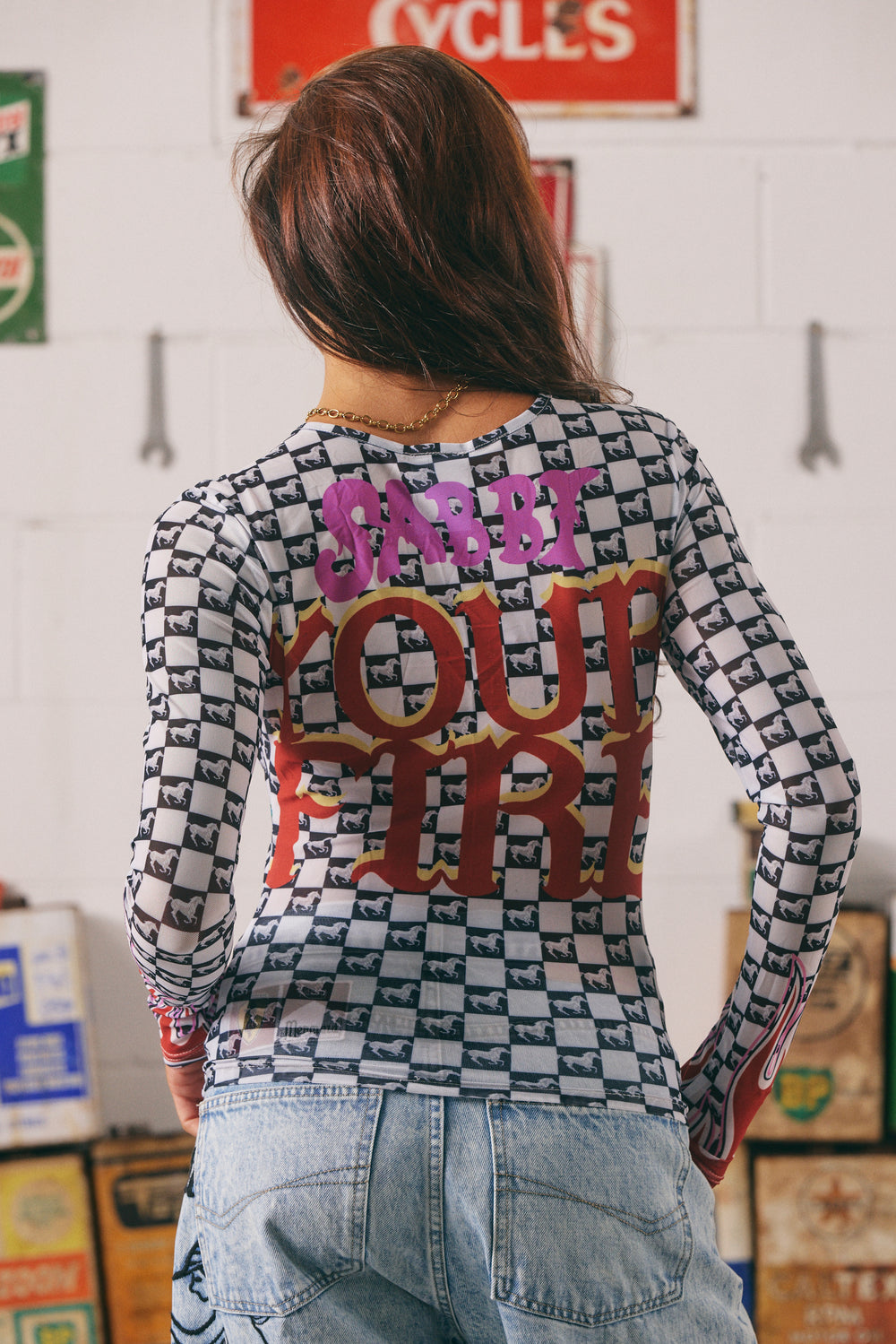 The Brenda Mesh Long Sleeve is your ultimate power-layer. Loud, unapologetic, and born to cause a scene. Crafted from 100% stretchy polyester mesh, this long sleeve clings in all the right places and breathes like a dream. Featuring an all-over checkerboard print with galloping ponies, a bold Brenda wing graphic across the chest, flames on the sleeves, and a back hit that says it all: SABBI YOU’RE FIRE.