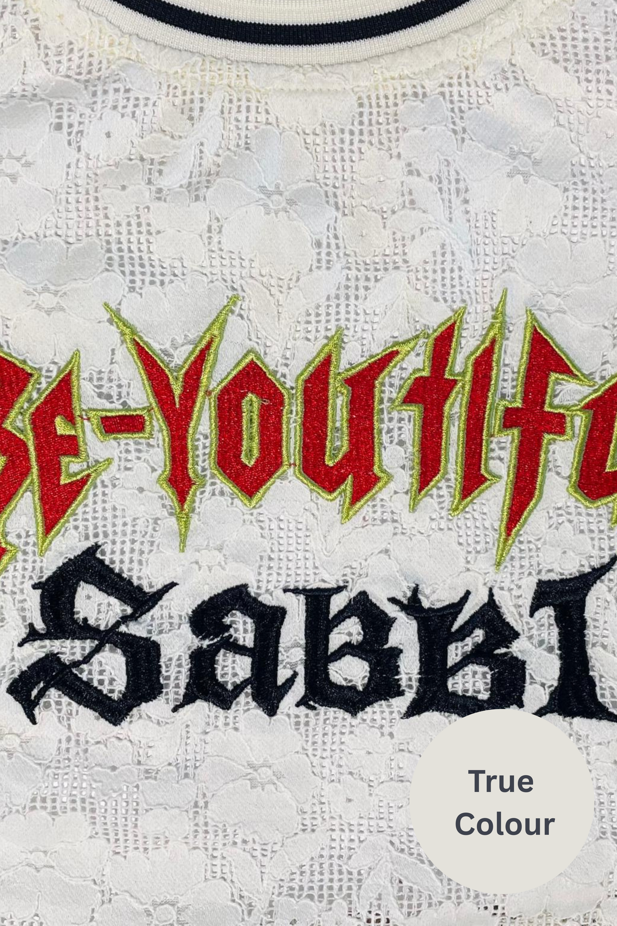The Be Youtiful Cream Lace Singlet brings metal-band energy to the streets. Think retro rock vibes, electric Sabbi logo and sheer black lace that teases just the right amount. Cropped to perfection with contrast trims, it's your go-to for gigs, late nights and all-day sass.